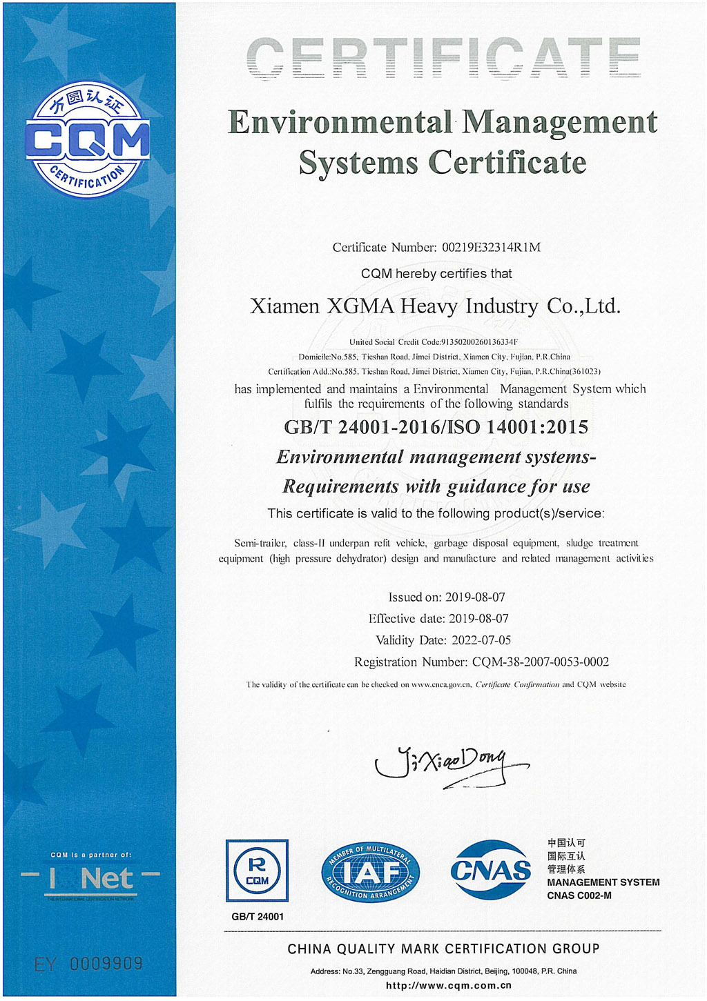 环境管理体系认证证书2019(英)